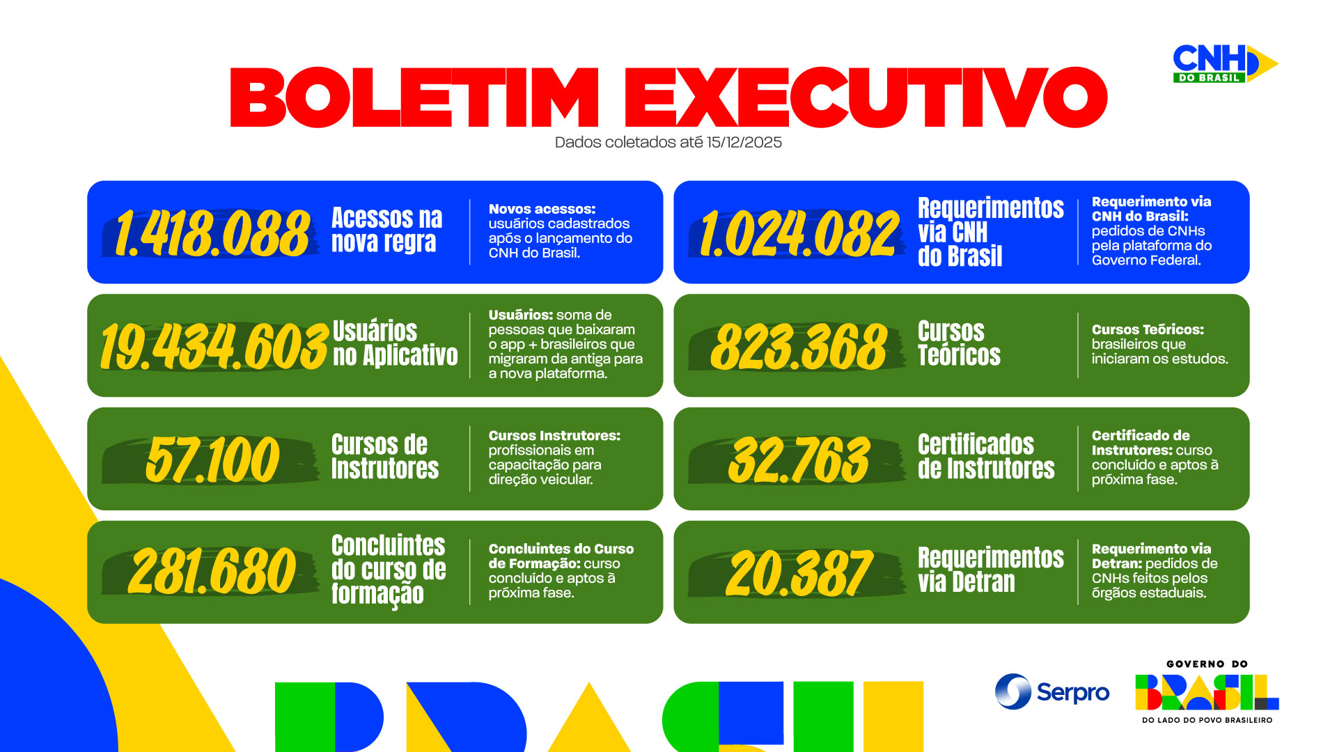 Aadesão ao aplicativo CNH do Brasil, iniciativa do Governo do Brasil, segue crescendo. A plataforma já conta com 19.434.603 usuários até esta segunda-feira (15), segundo levantamento da Secretaria Nacional de Trânsito (Senatran). O número de pedidos de abertura de habilitação pela ferramenta ultrapassa 1 milhão.