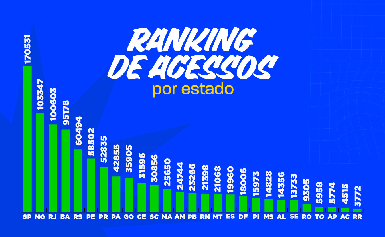 Entre os estados com maior número de acessos, São Paulo lidera o ranking, com mais de 170 mil registros, seguido por Minas Gerais e Rio de Janeiro, com pouco mais de 100 mil cada.