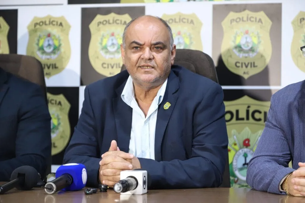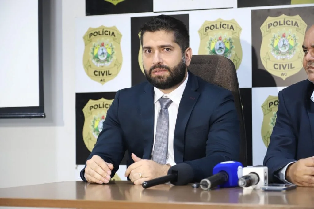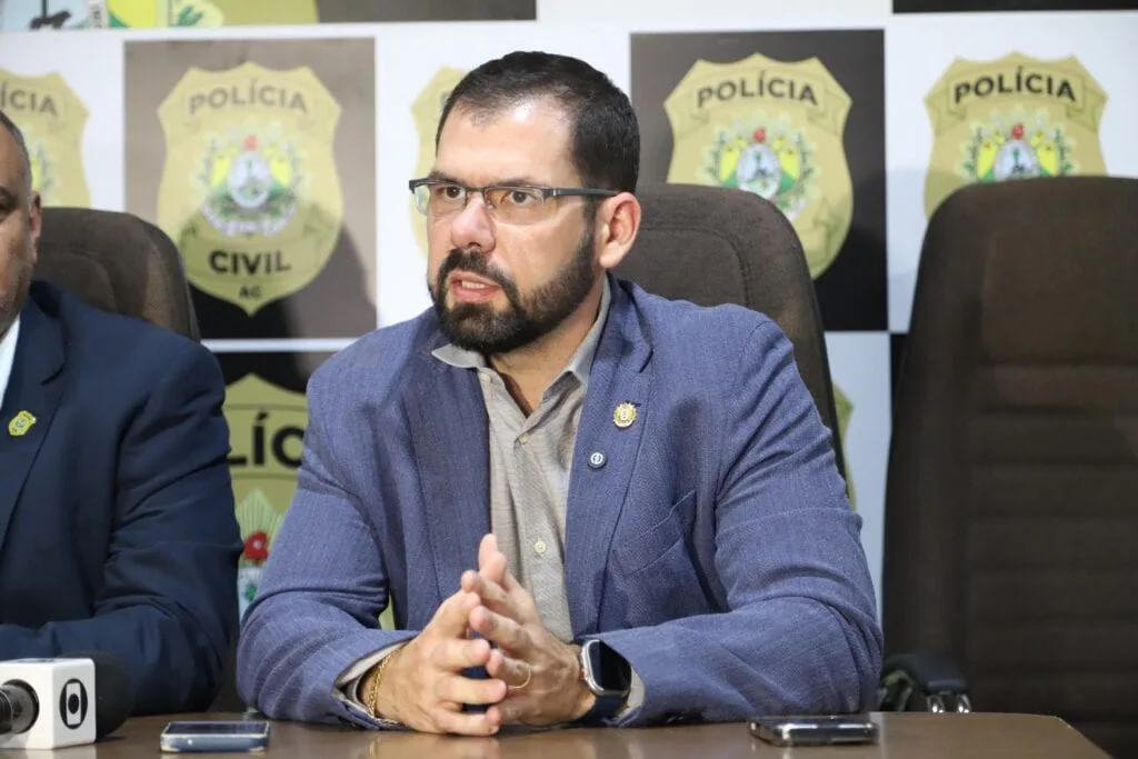 Durante coletiva de imprensa, o delegado-geral da PCAC falou sobre a operação. Foto: Alice Leão/SecomA investigação foi solicitada à Polícia Civil pela Secretaria de Estado de Saúde (Sesacre). Desde o início de 2023, a gestão da Sesacre levantava suspeitas que, com o avanço do tempo e a realização de investigações minuciosas, resultaram na confirmação das irregularidades.